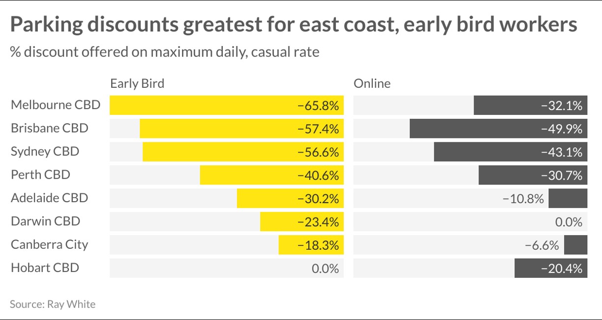 Melbourne CBD parking market has seen the worst longer-term growth of any other region. Over the last year, these daily rates have fallen slightly to $67.49, however, have recorded less than 0.5 per cent annual growth over the past ten years, highlighting the difficulty in CBD office market with long-term high vacancies and a strong WFH movement also affecting the car parking sector. Discounting is also strongest across the Melbourne CBD with early bird rates attracting more than a 65 per cent discount, aimed at the office workforce, this is the highest in the country followed by Brisbane and Sydney.