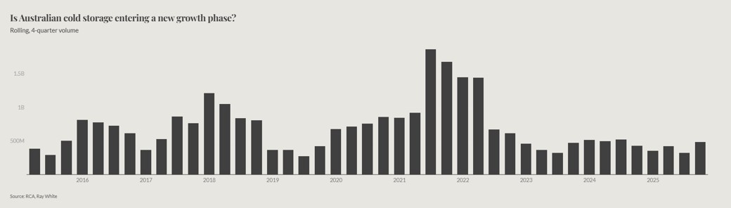 Australia’s cold storage sector is experiencing a pronounced acceleration in both investment activity and development sophistication as the asset class matures beyond its traditional origins as owner occupiers. Transaction volumes surged 156 per cent compared with the same quarter last year in the third quarter of 2025, reaching $259.6 million, combined with the previous three quarters, the rolling 12 month volume total now stands at $480.2 million, up 11.9 per cent on the prior period. This momentum signals not merely a recovery from subdued 2023 and 2024 levels, but a fundamental re-rating of the sector’s investment credentials among institutional and cross border capital.