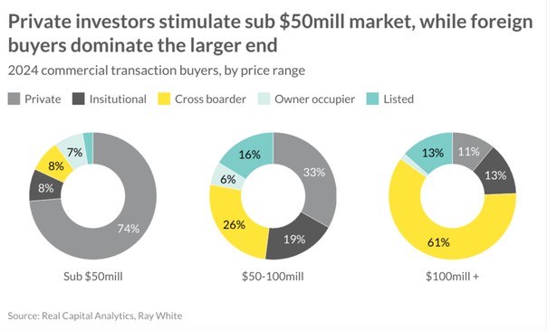 The market demonstrated clear segmentation across price points, with domestic private investors dominating the sub-$50 million segment, accounting for approximately three-quarters of transactions. These acquisitions were predominantly focused on industrial assets across NSW and Victoria, with private investors particularly active in last-mile logistics facilities and smaller industrial units that offer strong tenant covenants.