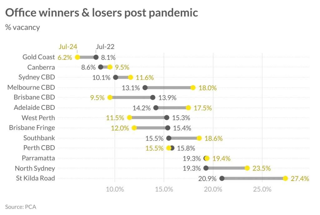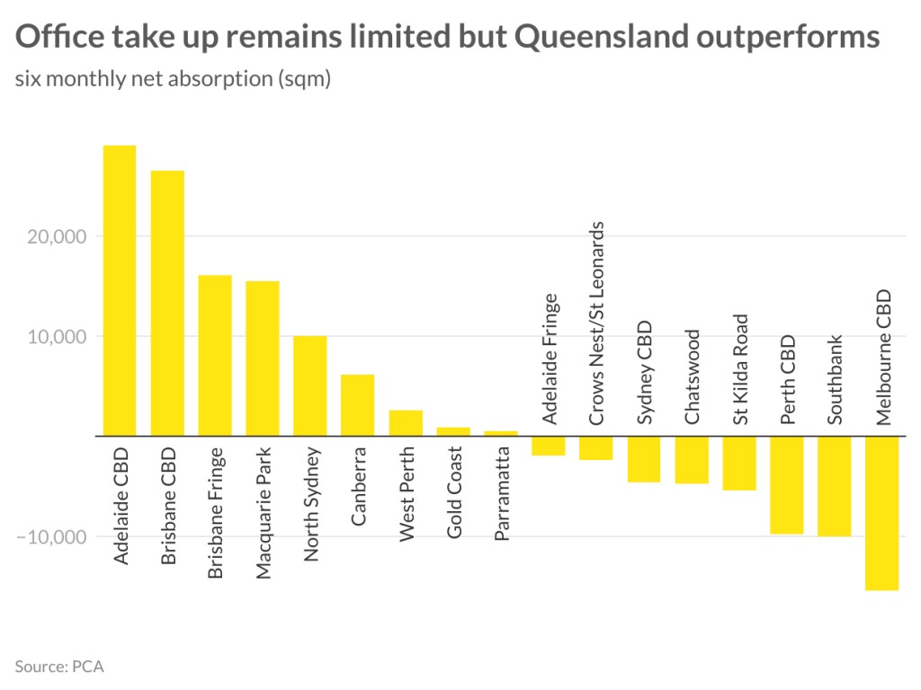 The office market’s recovery since the pandemic has been slow, with Queensland and Perth markets showing declining vacancy rates, indicating a return to “business as usual” compared to larger markets like Sydney and Melbourne. Melbourne CBD continues to struggle, with vacancy rates increasing for the ninth consecutive period to 18 per cent, now representing 943,775sqm of available stock.