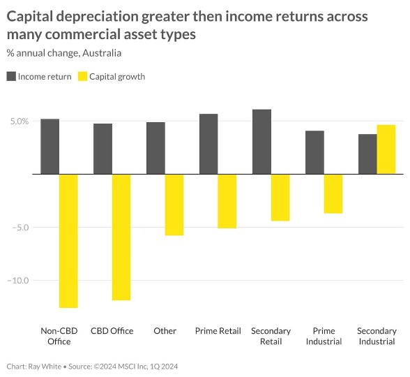 The office market has felt the brunt of these losses, with both non-CBD and CBD office markets recording -12.6 per cent and -11.9 per cent capital losses respectively over the past year. However, looking city-by-city there is still some positivity around. Perth CBD remains the stand out office performer this period, despite capital growth recorded at -5.7 per cent, income returns of six per cent offset this keeping total returns in positive territory, notably in the Premium and A-grade sector.